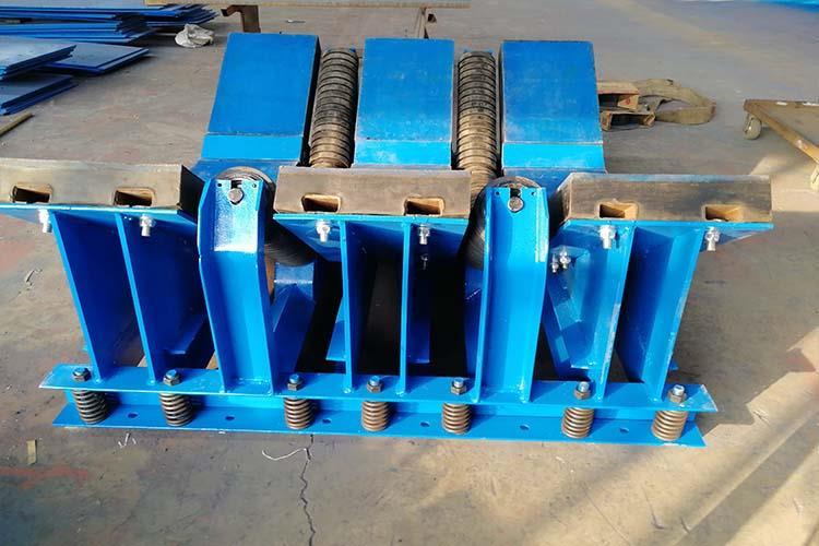 皮帶機(jī)緩沖床主要由緩沖支架和緩沖滑條組成,緩沖滑條主要三部分組成,超高分子量聚乙烯板(井下黑色阻燃)、彈性橡膠(阻燃抗靜電)、鋼構(gòu)等。
